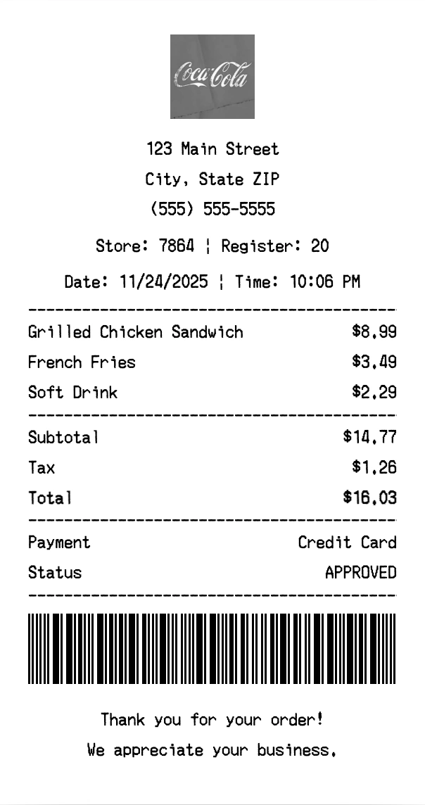 Create authentic Coca-Cola receipts for food & beverage purchases. Our free receipt generator tool helps you create professional, detailed receipts instantly. Perfect for business expense tracking, reimbursement requests, and personal documentation. Download high-quality PNG receipts in seconds, no signup required.