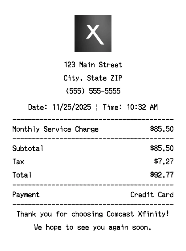 Create authentic Comcast Xfinity receipts for telecommunications purchases. Our free receipt generator tool helps you create professional, detailed receipts instantly. Perfect for business expense tracking, reimbursement requests, and personal documentation. Download high-quality PNG receipts in seconds, no signup required.