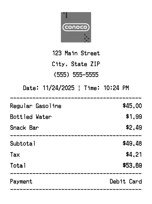 Create authentic Conoco receipts for gas station purchases. Our free receipt generator tool helps you create professional, detailed receipts instantly. Perfect for business expense tracking, reimbursement requests, and personal documentation. Download high-quality PNG receipts in seconds, no signup required.