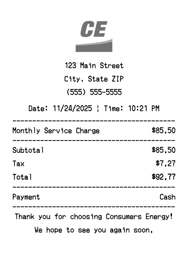 Create authentic Consumers Energy receipts instantly. Our free receipt generator produces professional energy receipts with company logo, itemized purchases, tax calculations, and payment details. Perfect for expense tracking, reimbursement, and documentation. Download high-quality PNG receipts in seconds.