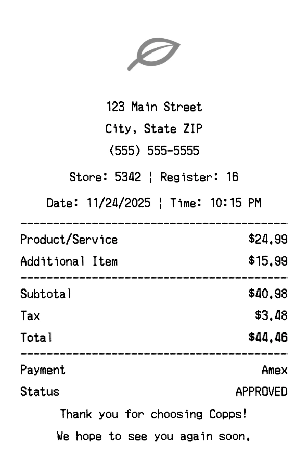 Our Copps receipt generator creates professional receipts that match the authentic Copps format. Each receipt includes the company logo, business information, transaction details, itemized purchase list, tax calculations, and payment information. All receipts are formatted to look exactly like real Copps receipts, making them perfect for expense reports, tax documentation, and reimbursement purposes.