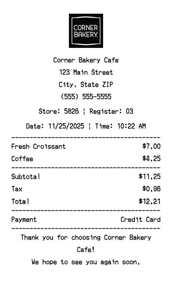 Create authentic Corner Bakery Cafe receipts for bakery purchases. Our free receipt generator tool helps you create professional, detailed receipts instantly. Perfect for business expense tracking, reimbursement requests, and personal documentation. Download high-quality PNG receipts in seconds, no signup required.