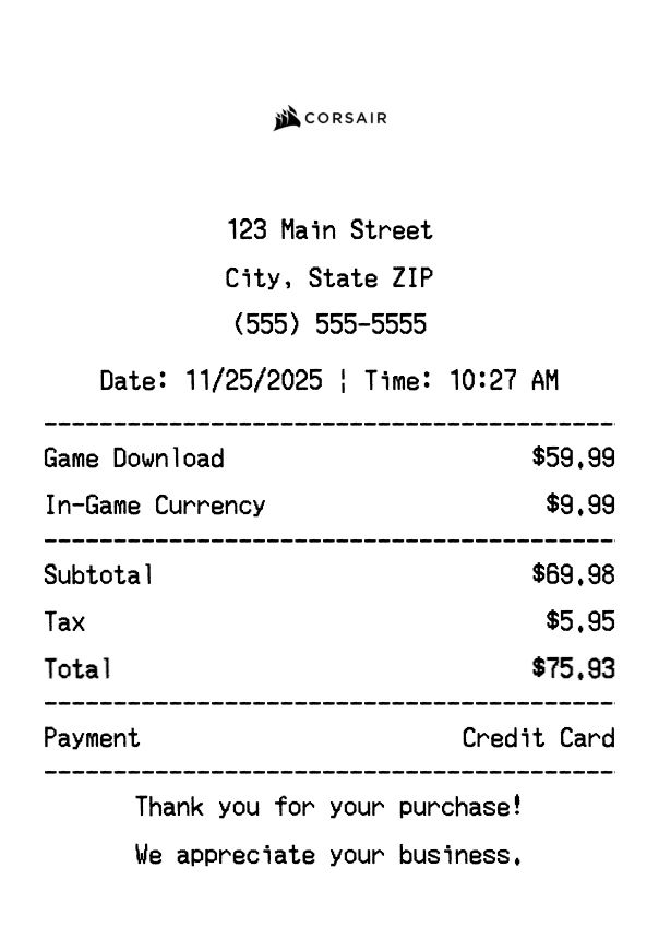Create authentic Corsair receipts instantly. Our free receipt generator produces professional gaming hardware receipts with company logo, itemized purchases, tax calculations, and payment details. Perfect for expense tracking, reimbursement, and documentation. Download high-quality PNG receipts in seconds.