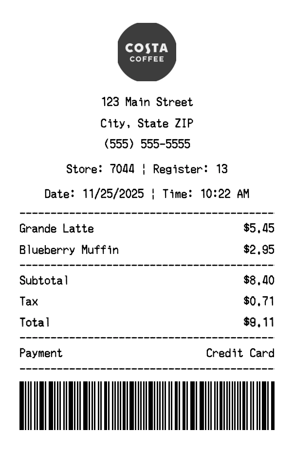 Create authentic Costa Coffee receipts for coffee purchases. Our free receipt generator tool helps you create professional, detailed receipts instantly. Perfect for business expense tracking, reimbursement requests, and personal documentation. Download high-quality PNG receipts in seconds, no signup required.