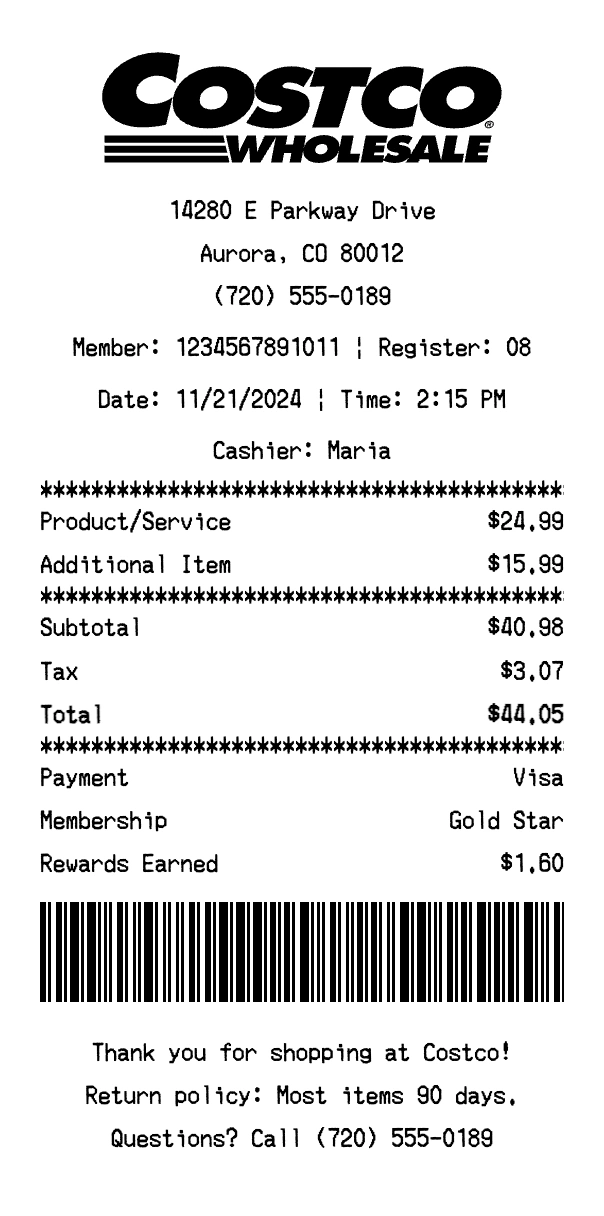 Create authentic Costco Wholesale receipts for general retail purchases. Our free receipt generator tool helps you create professional, detailed receipts instantly. Perfect for business expense tracking, reimbursement requests, and personal documentation. Download high-quality PNG receipts in seconds, no signup required.