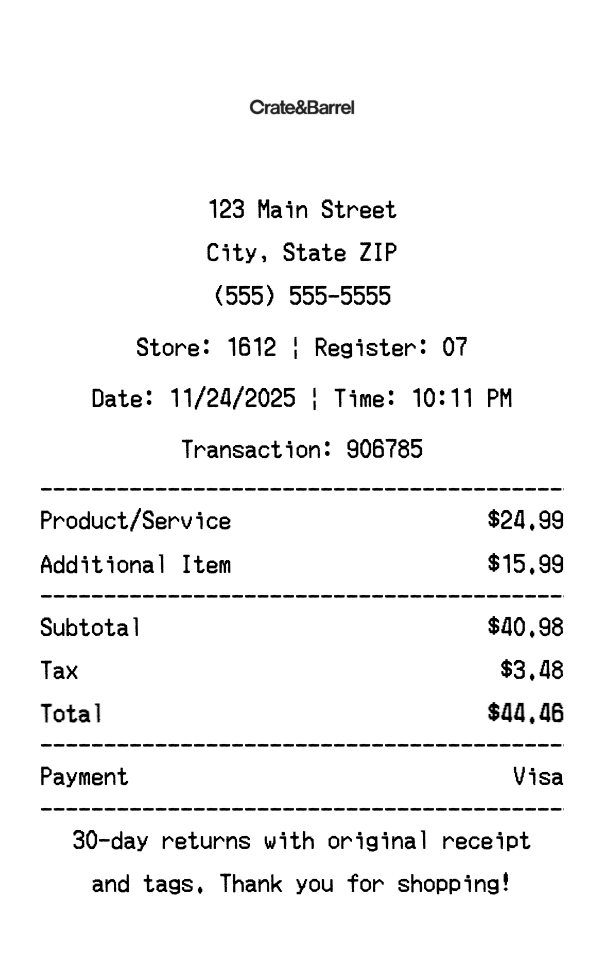 Create authentic Crate & Barrel receipts for furniture purchases. Our free receipt generator tool helps you create professional, detailed receipts instantly. Perfect for business expense tracking, reimbursement requests, and personal documentation. Download high-quality PNG receipts in seconds, no signup required.