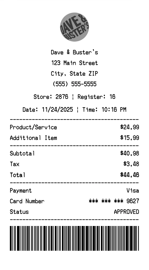 Create authentic Dave & Buster's receipts for casual dining purchases. Our free receipt generator tool helps you create professional, detailed receipts instantly. Perfect for business expense tracking, reimbursement requests, and personal documentation. Download high-quality PNG receipts in seconds, no signup required.