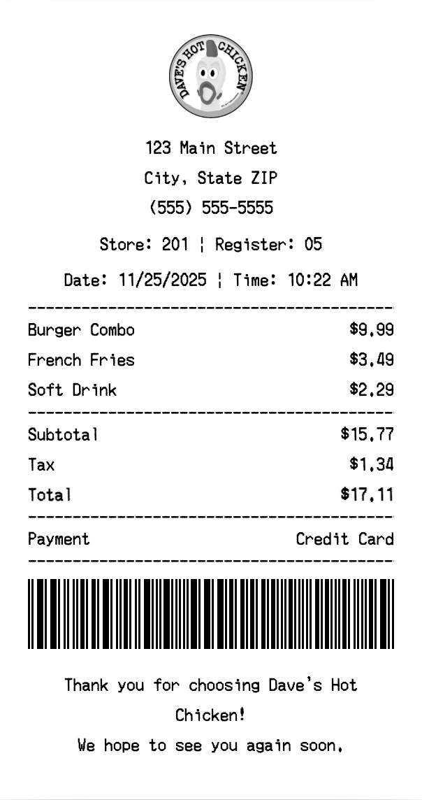 Create authentic Dave's Hot Chicken receipts for fast casual purchases. Our free receipt generator tool helps you create professional, detailed receipts instantly. Perfect for business expense tracking, reimbursement requests, and personal documentation. Download high-quality PNG receipts in seconds, no signup required.
