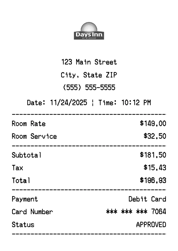 Create authentic Days Inn receipts for hotel purchases. Our free receipt generator tool helps you create professional, detailed receipts instantly. Perfect for business expense tracking, reimbursement requests, and personal documentation. Download high-quality PNG receipts in seconds, no signup required.