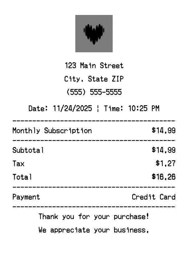 What format are the receipts? Receipts are generated as high-quality PNG images that you can download instantly and use for any documentation needs.