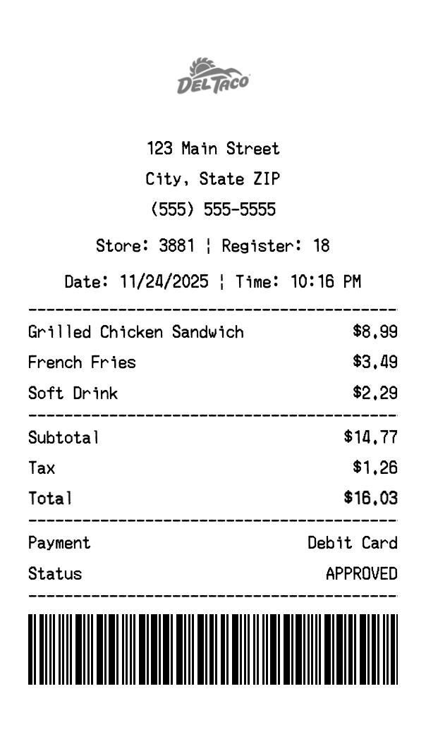 Create authentic Del Taco receipts for fast food purchases. Our free receipt generator tool helps you create professional, detailed receipts instantly. Perfect for business expense tracking, reimbursement requests, and personal documentation. Download high-quality PNG receipts in seconds, no signup required.