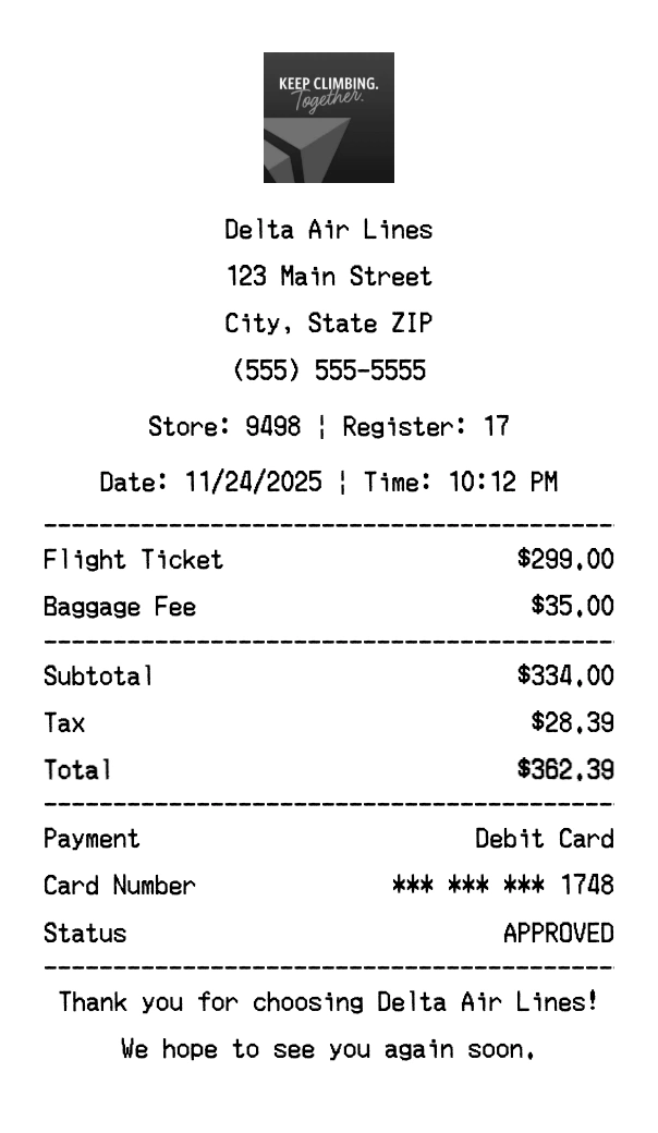 Create authentic Delta Air Lines receipts instantly. Our free receipt generator produces professional airline receipts with company logo, itemized purchases, tax calculations, and payment details. Perfect for expense tracking, reimbursement, and documentation. Download high-quality PNG receipts in seconds.