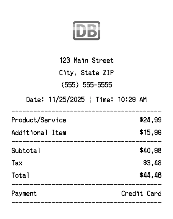 Create authentic Deutsche Bahn receipts instantly. Our free receipt generator produces professional rail receipts with company logo, itemized purchases, tax calculations, and payment details. Perfect for expense tracking, reimbursement, and documentation. Download high-quality PNG receipts in seconds.
