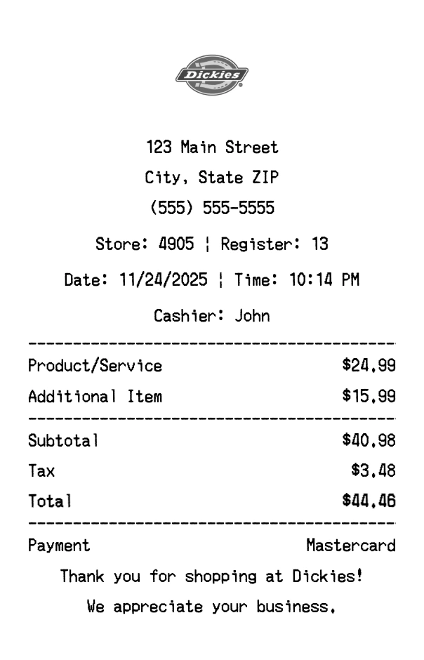 Create authentic Dickies receipts for workwear purchases. Our free receipt generator tool helps you create professional, detailed receipts instantly. Perfect for business expense tracking, reimbursement requests, and personal documentation. Download high-quality PNG receipts in seconds, no signup required.