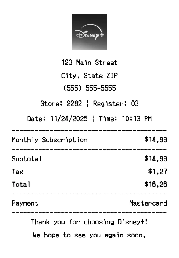 Create authentic Disney receipts instantly - including Disney+ (Disney Plus) streaming subscriptions and Disney Movies purchases. Our free receipt generator produces professional streaming receipts with company logo, itemized purchases, tax calculations, and payment details. Perfect for expense tracking, reimbursement, and documentation. Download high-quality PNG receipts in seconds.