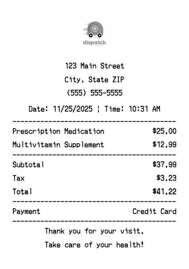 Create authentic DispatchHealth receipts instantly. Our free receipt generator produces professional healthcare receipts with company logo, itemized purchases, tax calculations, and payment details. Perfect for expense tracking, reimbursement, and documentation. Download high-quality PNG receipts in seconds.