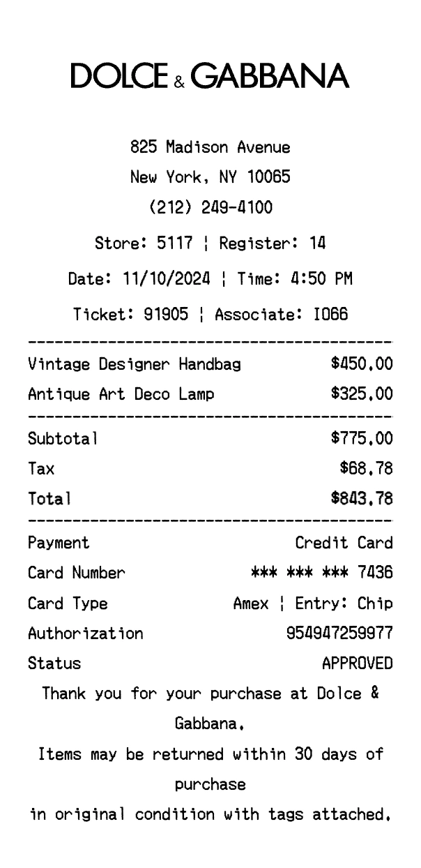 Create authentic Dolce & Gabbana receipts for fashion & luxury purchases. Our free receipt generator tool helps you create professional, detailed receipts instantly. Perfect for business expense tracking, reimbursement requests, and personal documentation. Download high-quality PNG receipts in seconds, no signup required.