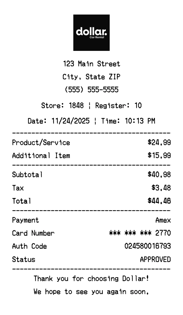 Our Dollar receipt generator creates professional receipts that match the authentic Dollar format. Each receipt includes the company logo, business information, transaction details, itemized purchase list, tax calculations, and payment information. All receipts are formatted to look exactly like real Dollar receipts, making them perfect for expense reports, tax documentation, and reimbursement purposes.