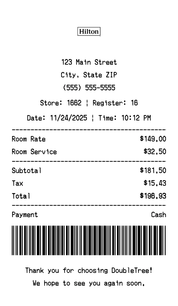 Create authentic DoubleTree receipts for hotel purchases. Our free receipt generator tool helps you create professional, detailed receipts instantly. Perfect for business expense tracking, reimbursement requests, and personal documentation. Download high-quality PNG receipts in seconds, no signup required.