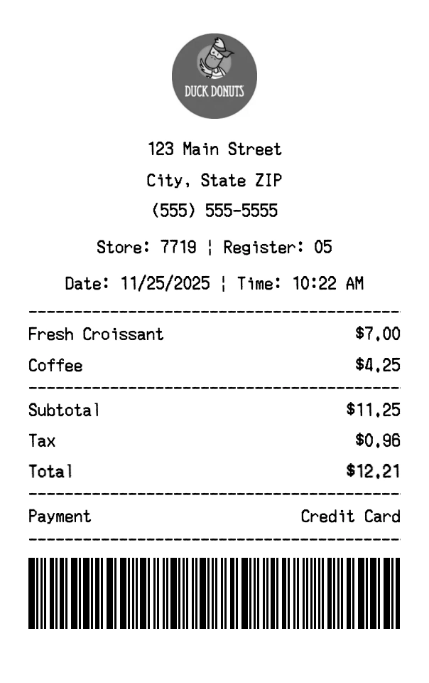 Create authentic Duck Donuts receipts for bakery purchases. Our free receipt generator tool helps you create professional, detailed receipts instantly. Perfect for business expense tracking, reimbursement requests, and personal documentation. Download high-quality PNG receipts in seconds, no signup required.