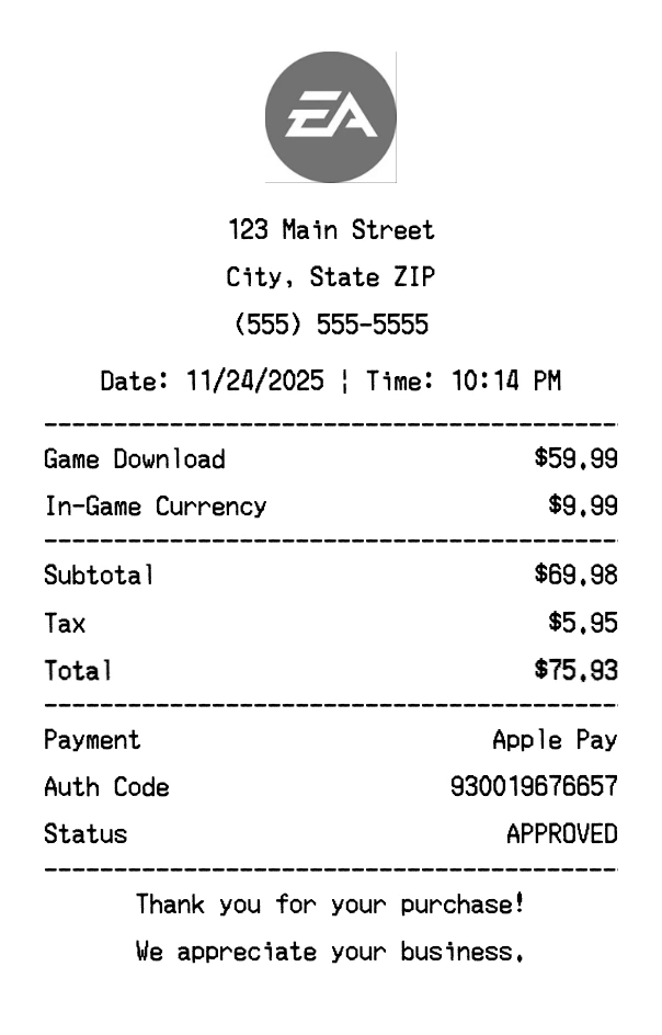 Create authentic EA receipts instantly. Our free receipt generator produces professional gaming receipts with company logo, itemized purchases, tax calculations, and payment details. Perfect for expense tracking, reimbursement, and documentation. Download high-quality PNG receipts in seconds.