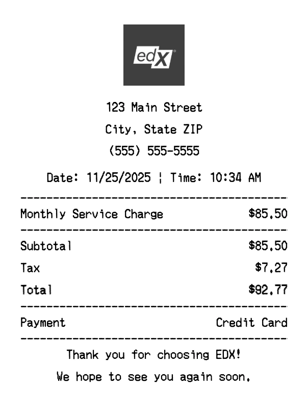 Our EDX receipt generator creates professional receipts that match the authentic EDX format. Each receipt includes the company logo, business information, transaction details, itemized purchase list, tax calculations, and payment information. All receipts are formatted to look exactly like real EDX receipts, making them perfect for expense reports, tax documentation, and reimbursement purposes.