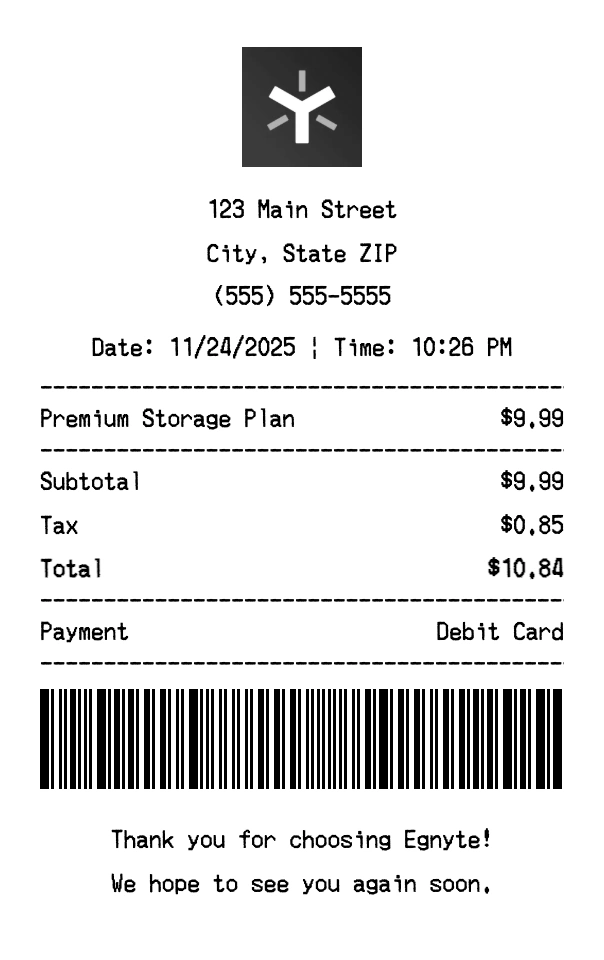 Create authentic Egnyte receipts instantly. Our free receipt generator produces professional cloud storage receipts with company logo, itemized purchases, tax calculations, and payment details. Perfect for expense tracking, reimbursement, and documentation. Download high-quality PNG receipts in seconds.