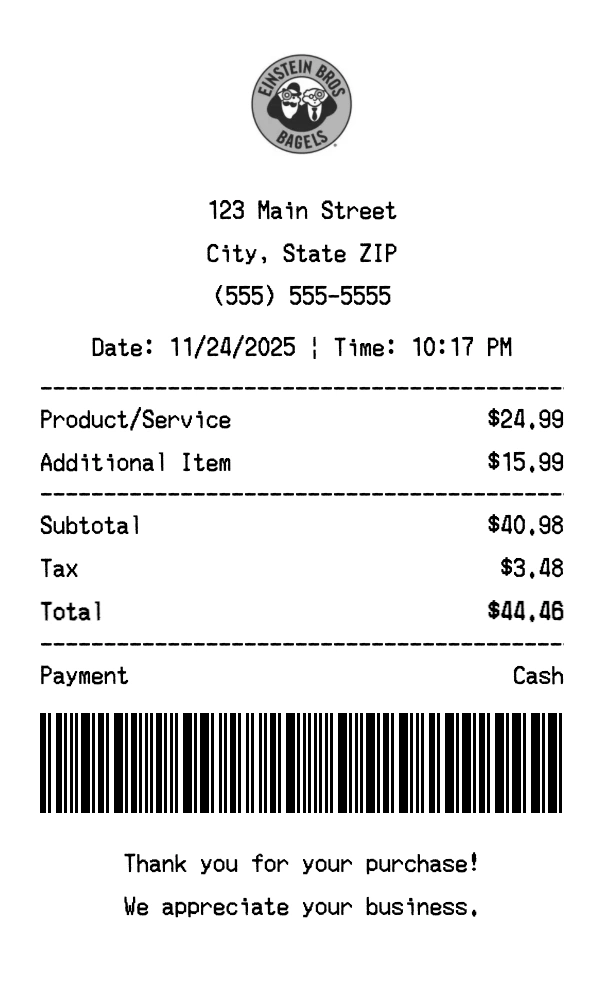 Create authentic Einstein Bros receipts for cafe purchases. Our free receipt generator tool helps you create professional, detailed receipts instantly. Perfect for business expense tracking, reimbursement requests, and personal documentation. Download high-quality PNG receipts in seconds, no signup required.