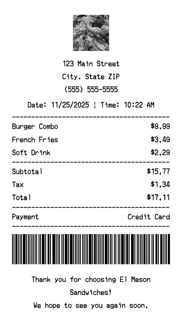 Create authentic El Meson Sandwiches receipts instantly. Our free receipt generator produces professional fast casual receipts with company logo, itemized purchases, tax calculations, and payment details. Perfect for expense tracking, reimbursement, and documentation. Download high-quality PNG receipts in seconds.