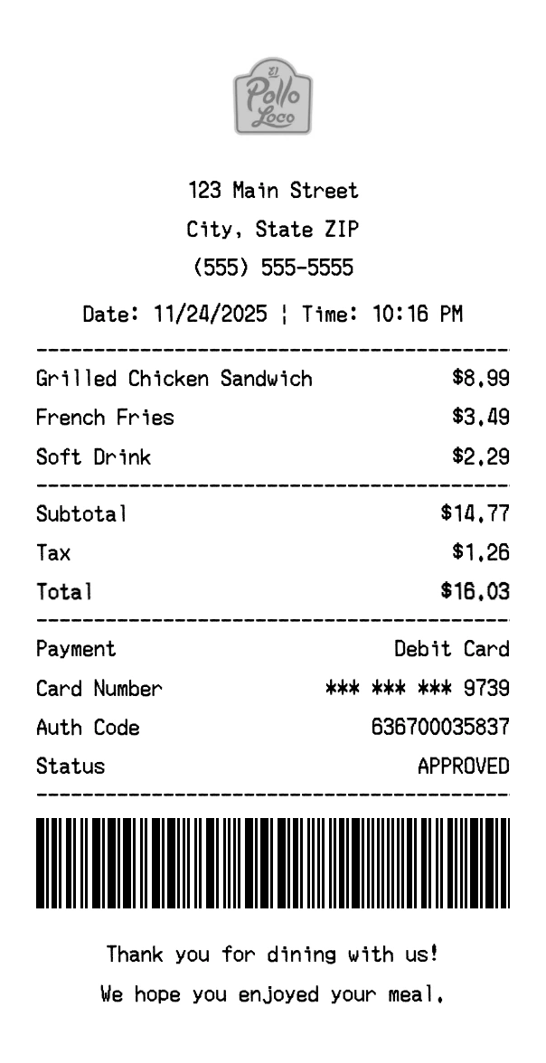 Create authentic El Pollo Loco receipts for fast food purchases. Our free receipt generator tool helps you create professional, detailed receipts instantly. Perfect for business expense tracking, reimbursement requests, and personal documentation. Download high-quality PNG receipts in seconds, no signup required.