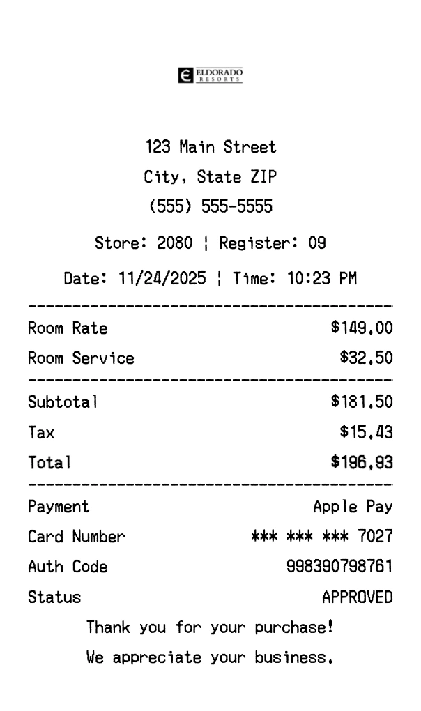 Create authentic Eldorado Resorts receipts for hotel purchases. Our free receipt generator tool helps you create professional, detailed receipts instantly. Perfect for business expense tracking, reimbursement requests, and personal documentation. Download high-quality PNG receipts in seconds, no signup required.