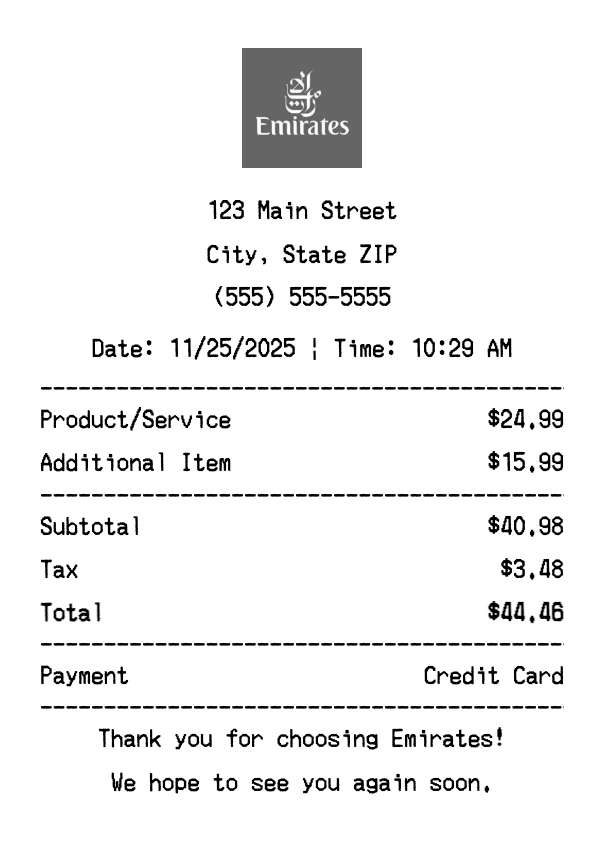 Create authentic Emirates receipts instantly. Our free receipt generator produces professional airlines receipts with company logo, itemized purchases, tax calculations, and payment details. Perfect for expense tracking, reimbursement, and documentation. Download high-quality PNG receipts in seconds.