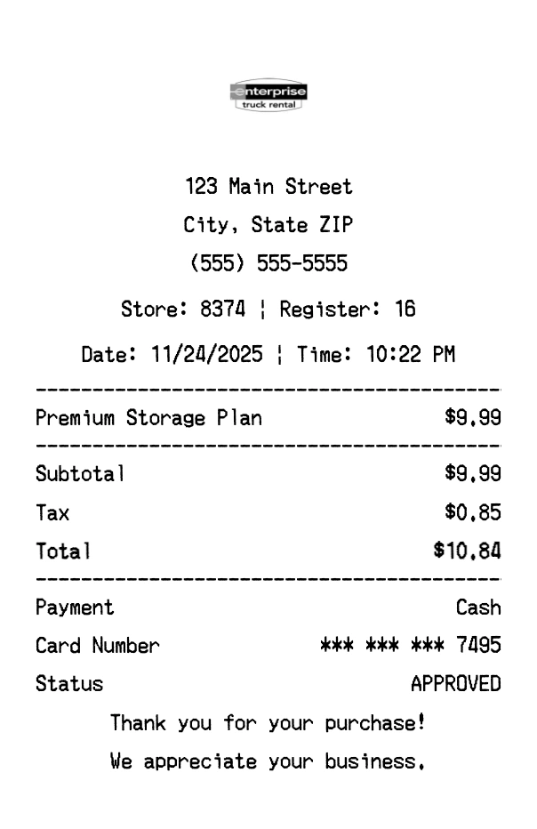Create authentic Enterprise Truck Rental receipts instantly. Our free receipt generator produces professional moving & storage receipts with company logo, itemized purchases, tax calculations, and payment details. Perfect for expense tracking, reimbursement, and documentation. Download high-quality PNG receipts in seconds.