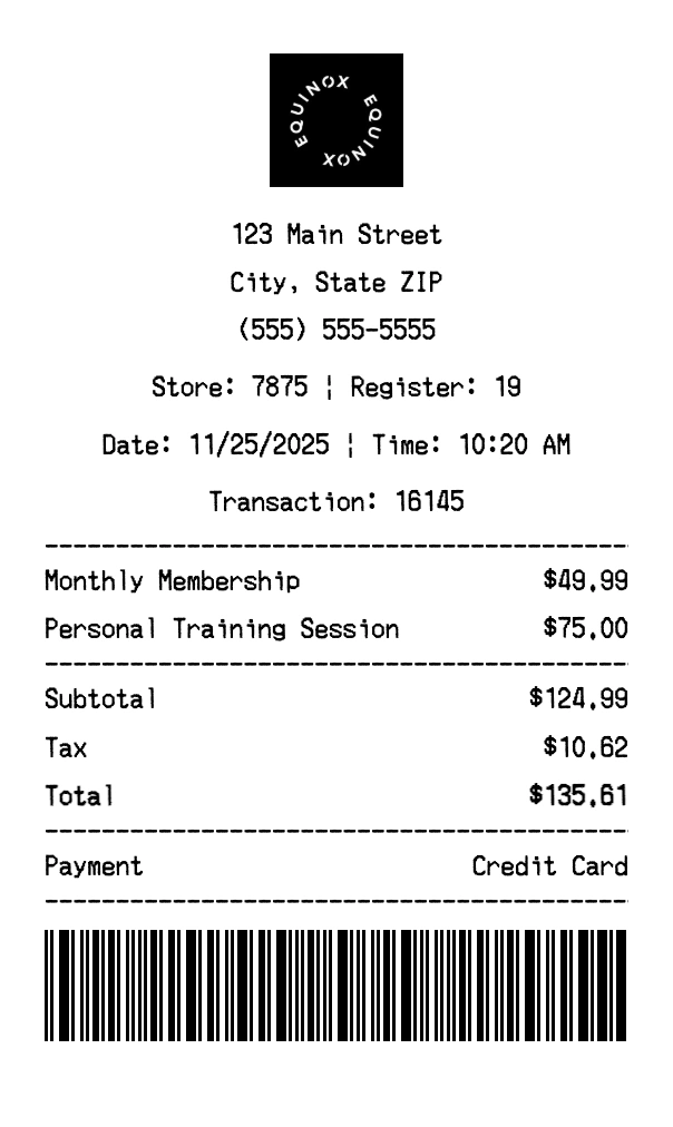 Create authentic Equinox receipts for fitness purchases. Our free receipt generator tool helps you create professional, detailed receipts instantly. Perfect for business expense tracking, reimbursement requests, and personal documentation. Download high-quality PNG receipts in seconds, no signup required.