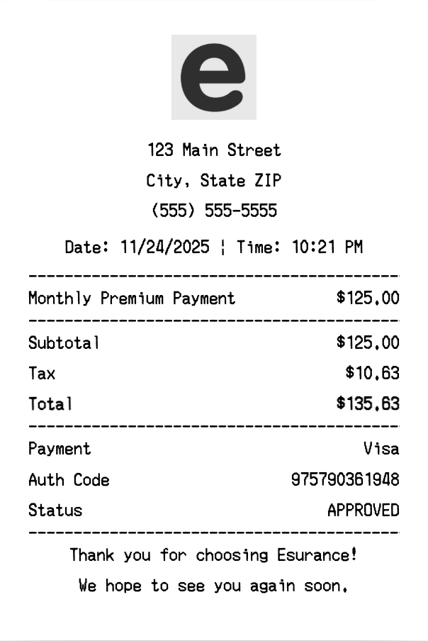 Create authentic Esurance receipts instantly. Our free receipt generator produces professional insurance receipts with company logo, itemized purchases, tax calculations, and payment details. Perfect for expense tracking, reimbursement, and documentation. Download high-quality PNG receipts in seconds.