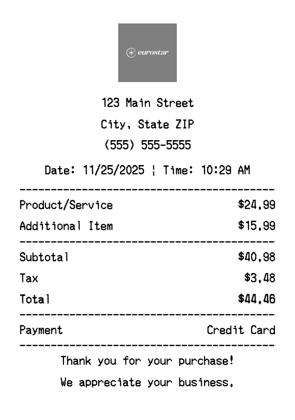 Create authentic Eurostar receipts instantly. Our free receipt generator produces professional rail receipts with company logo, itemized purchases, tax calculations, and payment details. Perfect for expense tracking, reimbursement, and documentation. Download high-quality PNG receipts in seconds.