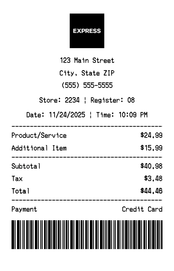 Create authentic Express receipts instantly. Our free receipt generator produces professional apparel receipts with company logo, itemized purchases, tax calculations, and payment details. Perfect for expense tracking, reimbursement, and documentation. Download high-quality PNG receipts in seconds.