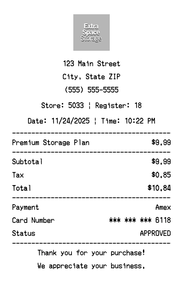 Create authentic Extra Space Storage receipts instantly. Our free receipt generator produces professional storage receipts with company logo, itemized purchases, tax calculations, and payment details. Perfect for expense tracking, reimbursement, and documentation. Download high-quality PNG receipts in seconds.