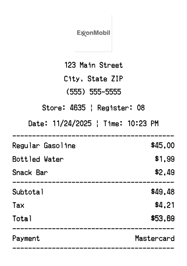 Create authentic ExxonMobil receipts instantly. Our free receipt generator produces professional gas station receipts with company logo, itemized purchases, tax calculations, and payment details. Perfect for expense tracking, reimbursement, and documentation. Download high-quality PNG receipts in seconds.