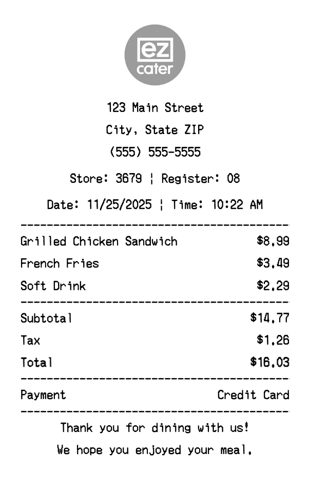 Create authentic Ezcater receipts instantly. Our free receipt generator produces professional food delivery receipts with company logo, itemized purchases, tax calculations, and payment details. Perfect for expense tracking, reimbursement, and documentation. Download high-quality PNG receipts in seconds.