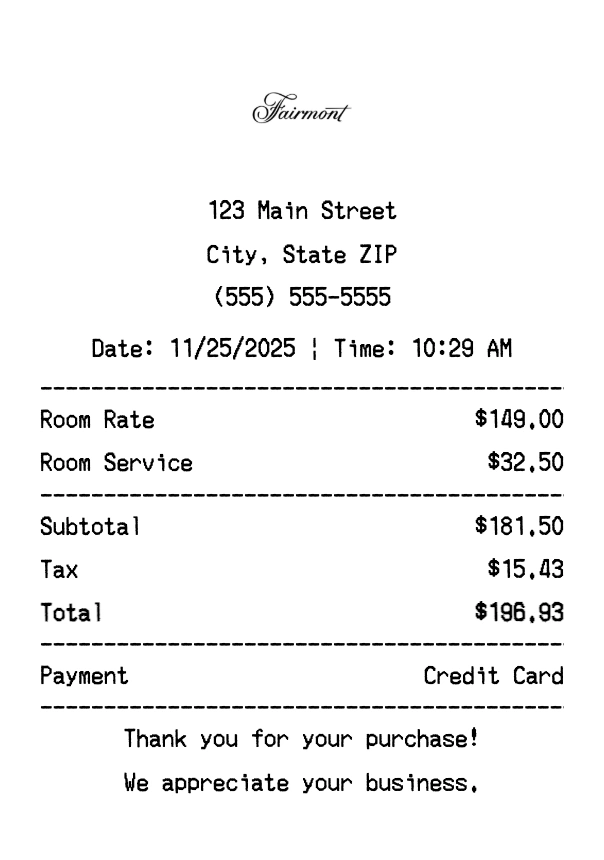 Create authentic Fairmont Hotels receipts instantly. Our free receipt generator produces professional hotels receipts with company logo, itemized purchases, tax calculations, and payment details. Perfect for expense tracking, reimbursement, and documentation. Download high-quality PNG receipts in seconds.
