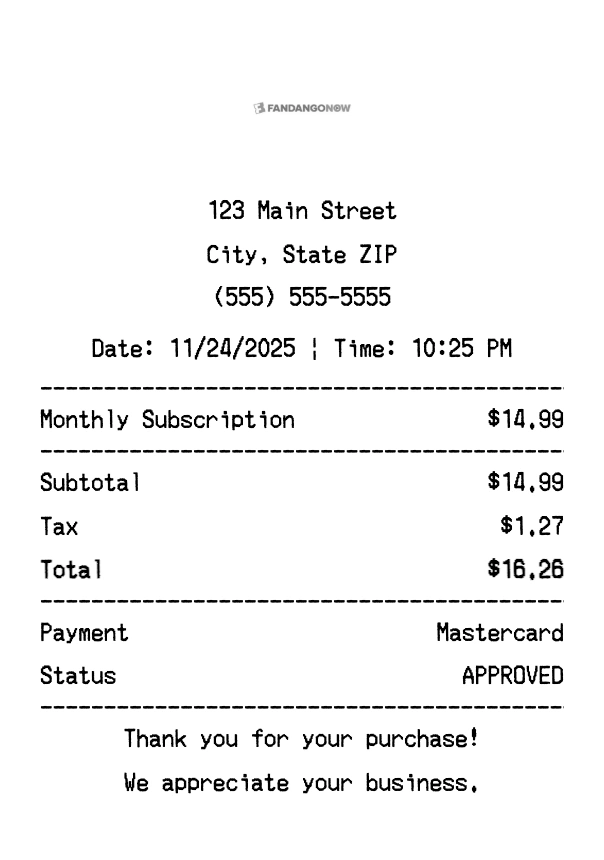Create authentic FandangoNOW receipts instantly. Our free receipt generator produces professional streaming receipts with company logo, itemized purchases, tax calculations, and payment details. Perfect for expense tracking, reimbursement, and documentation. Download high-quality PNG receipts in seconds.