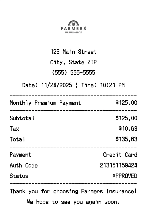 Our Farmers Insurance receipt generator creates professional receipts that match the authentic Farmers Insurance format. Each receipt includes the company logo, business information, transaction details, itemized purchase list, tax calculations, and payment information. All receipts are formatted to look exactly like real Farmers Insurance receipts, making them perfect for expense reports, tax documentation, and reimbursement purposes.