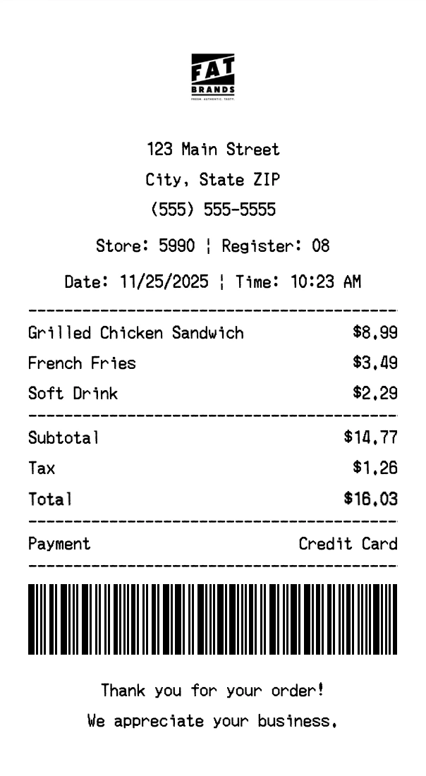 Create authentic Fat Brands receipts for restaurant group purchases. Our free receipt generator tool helps you create professional, detailed receipts instantly. Perfect for business expense tracking, reimbursement requests, and personal documentation. Download high-quality PNG receipts in seconds, no signup required.
