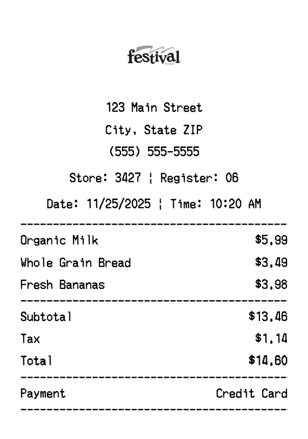 Create authentic Festival Foods receipts for grocery store purchases. Our free receipt generator tool helps you create professional, detailed receipts instantly. Perfect for business expense tracking, reimbursement requests, and personal documentation. Download high-quality PNG receipts in seconds, no signup required.