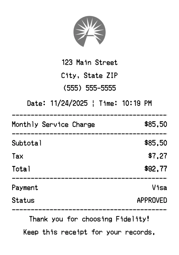Create authentic Fidelity receipts instantly. Our free receipt generator produces professional financial services receipts with company logo, itemized purchases, tax calculations, and payment details. Perfect for expense tracking, reimbursement, and documentation. Download high-quality PNG receipts in seconds.