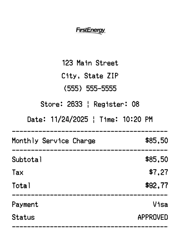 Create authentic FirstEnergy receipts instantly. Our free receipt generator produces professional energy receipts with company logo, itemized purchases, tax calculations, and payment details. Perfect for expense tracking, reimbursement, and documentation. Download high-quality PNG receipts in seconds.