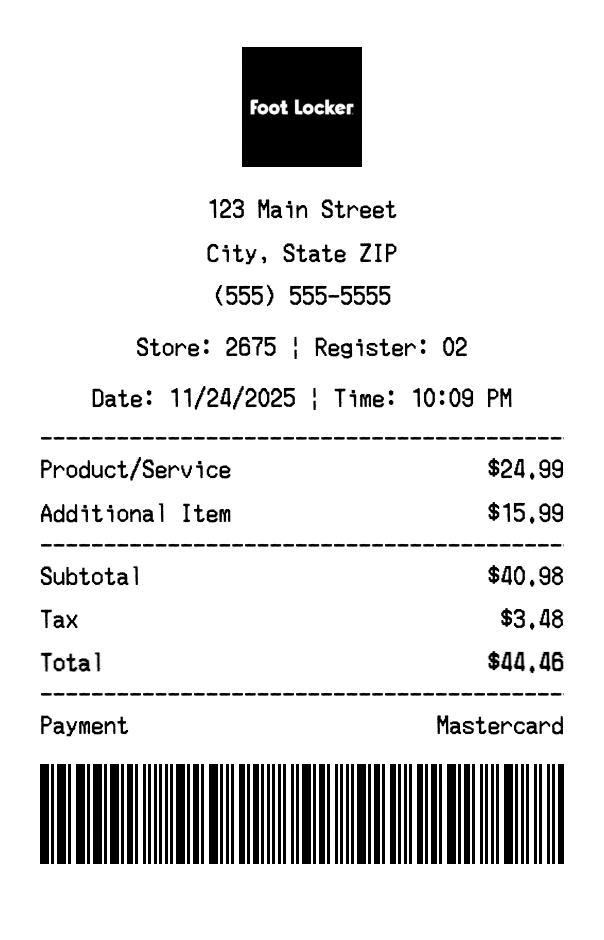 Create authentic Foot Locker receipts for footwear purchases. Our free receipt generator tool helps you create professional, detailed receipts instantly. Perfect for business expense tracking, reimbursement requests, and personal documentation. Download high-quality PNG receipts in seconds, no signup required.