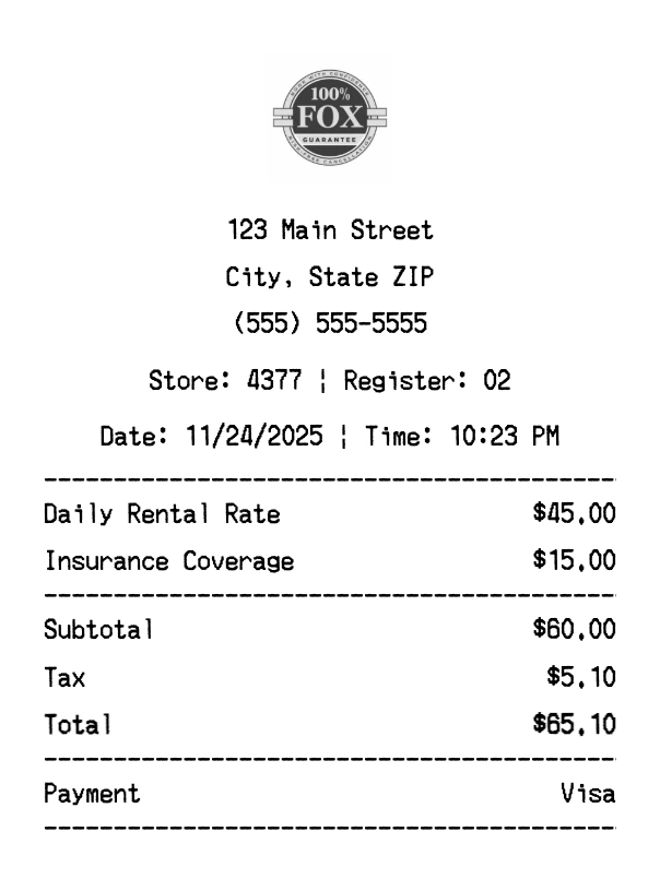 Create authentic Fox Rent A Car receipts instantly. Our free receipt generator produces professional car rental receipts with company logo, itemized purchases, tax calculations, and payment details. Perfect for expense tracking, reimbursement, and documentation. Download high-quality PNG receipts in seconds.