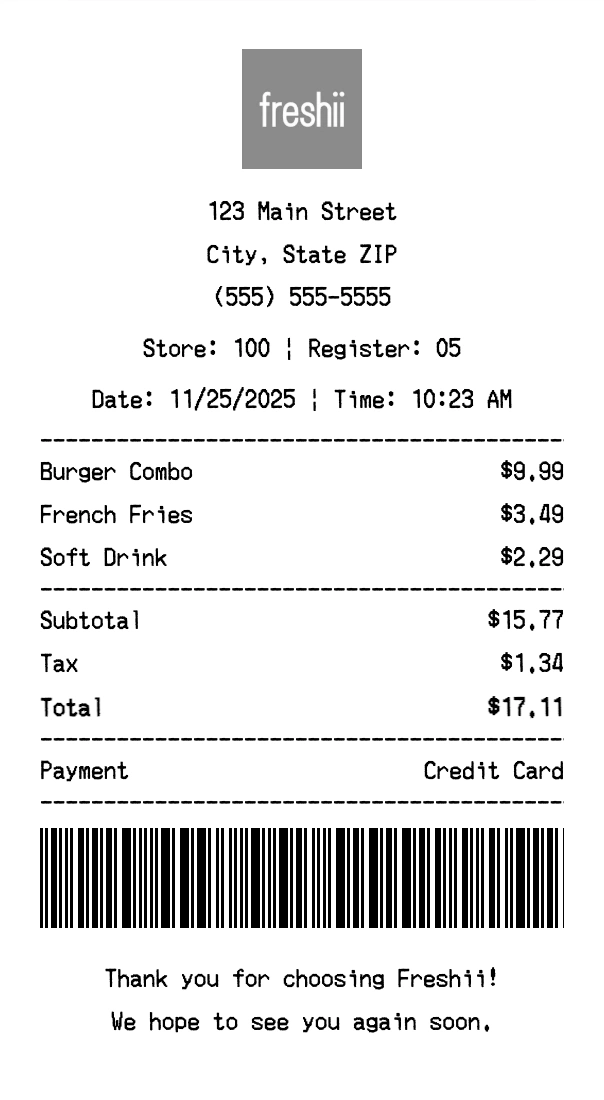 Create authentic Freshii receipts instantly. Our free receipt generator produces professional fast casual receipts with company logo, itemized purchases, tax calculations, and payment details. Perfect for expense tracking, reimbursement, and documentation. Download high-quality PNG receipts in seconds.